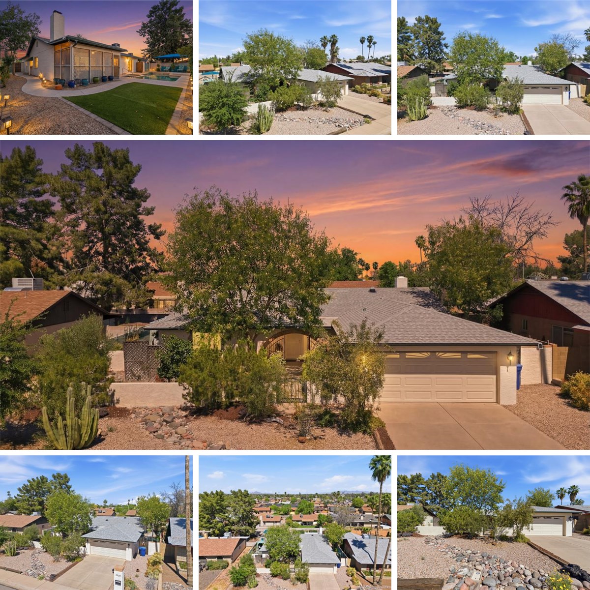Relax in the the large family room & enjoy views of the lush backyard landscaping & pool. You will find peace & quiet in the multiple sitting areas around the home including the private gated front porch overlooking the yard & active garden bed, the side yard to enjoy quite mornings & evenings, the enclosed Arizona room, or under the umbrella by the Lake Tahoe Sand colored pool.