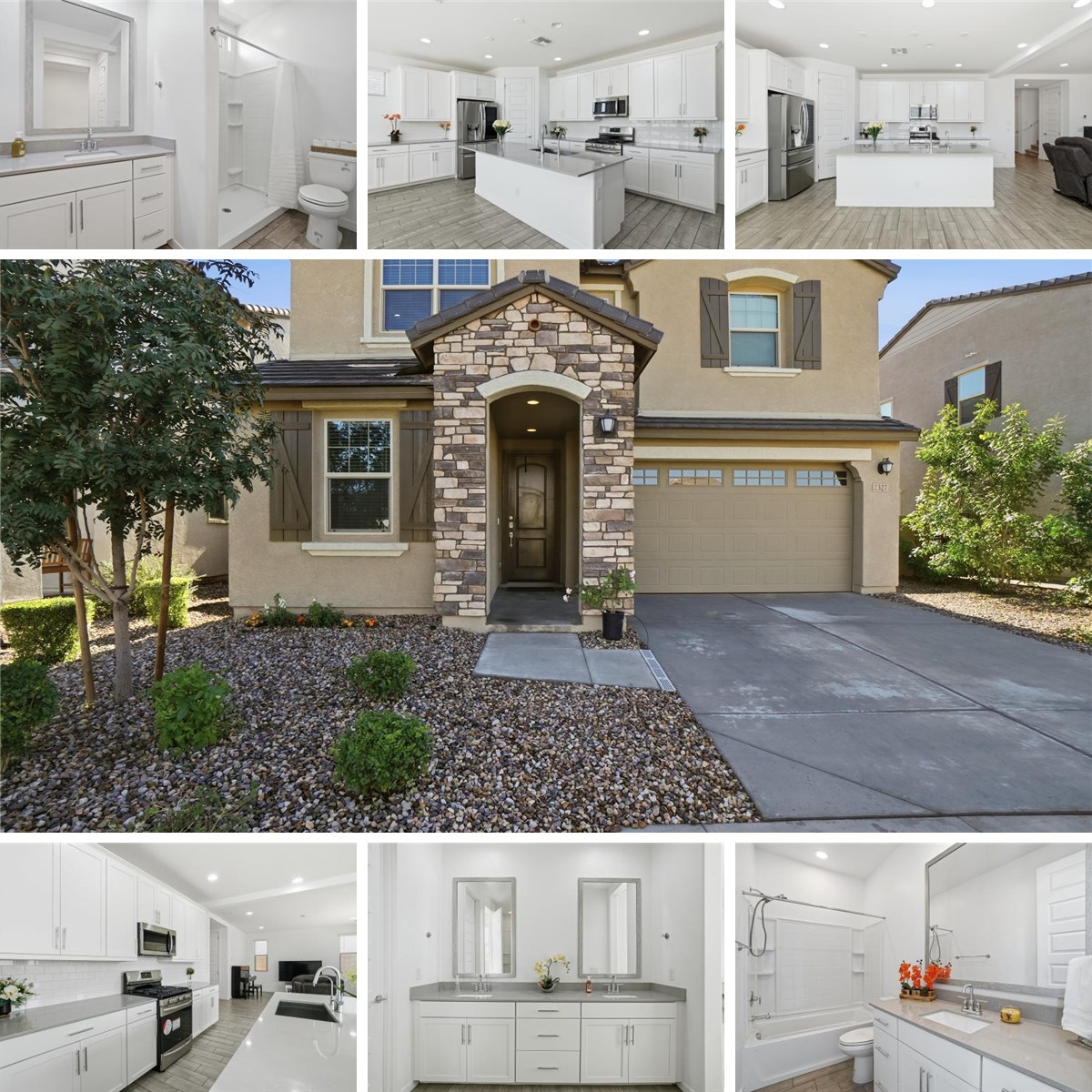 The private primary suite is a true retreat, featuring a spa-style bathroom with oversized walk-in shower, built-in bench, raised vanities, double sinks, framed mirrors, and an oversized walk-in closet. Additional highlights include an epoxied 2-car garage and a flexible closing timeline.