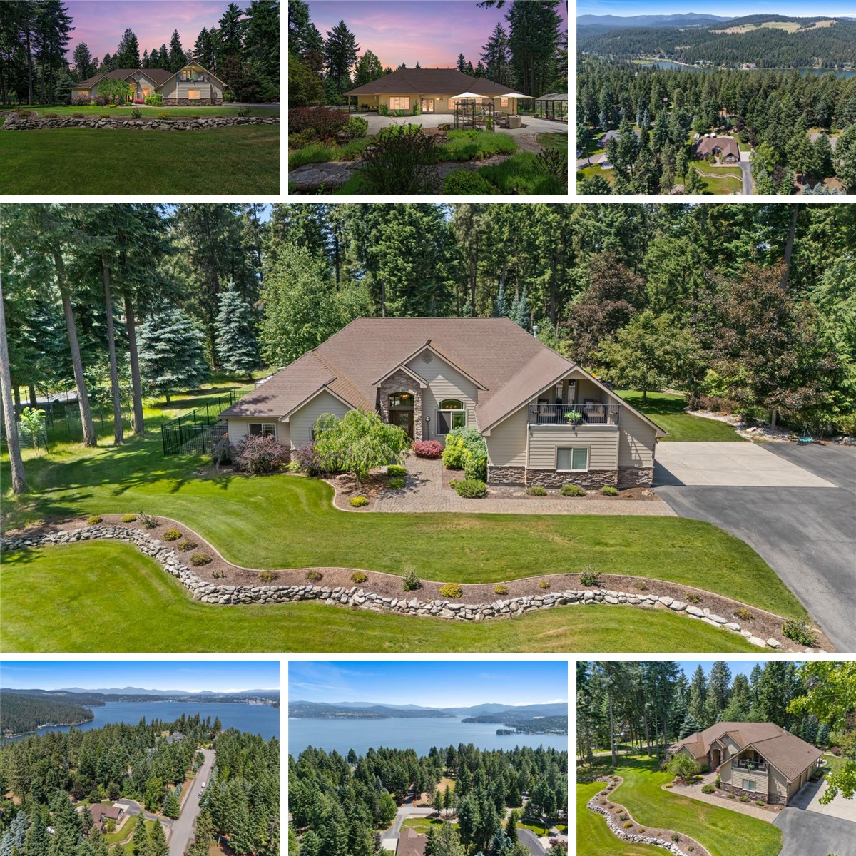 Discover luxury in the gated Harbor View Estates, just 20 minutes from downtown Coeur d'Alene! This 3,231 sqft masterpiece boasts 3 bedrooms, 3.5 bathrooms, and stunning filtered lake views. Inside, find soaring vaulted ceilings, a gourmet kitchen, and a home office with built-in desks for two. The bonus room above the garage, with a covered balcony and French doors, offers flexible space. The home has two hot water heaters, and whole-home vacuum system. The 2,500 sqft patio, pre-wired for an outdoor kitchen or pergola, features a 220V hot tub outlet, two fire pits, and a flagstone water feature. Enjoy a fenced garden, greenhouse, and fruit trees. An automatic whole-home generator and owned 500-gallon propane tank ensure reliability. Park effortlessly with a 6-car driveway and oversized 3-car garage. Residents access a private community beach and pavilion on iconic Lake Coeur d'Alene. Seize this rare opportunity to own paradise!